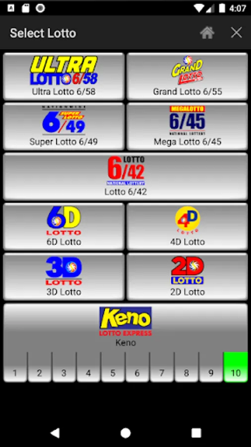 Ultra Lotto 6/58, Grand Lotto 6/55, Super Lotto 6/49, Mega Lotto 6/45, Lotto 6/42, 6D Lotto, 4D Lotto, 3D Lotto, 2D Lotto.