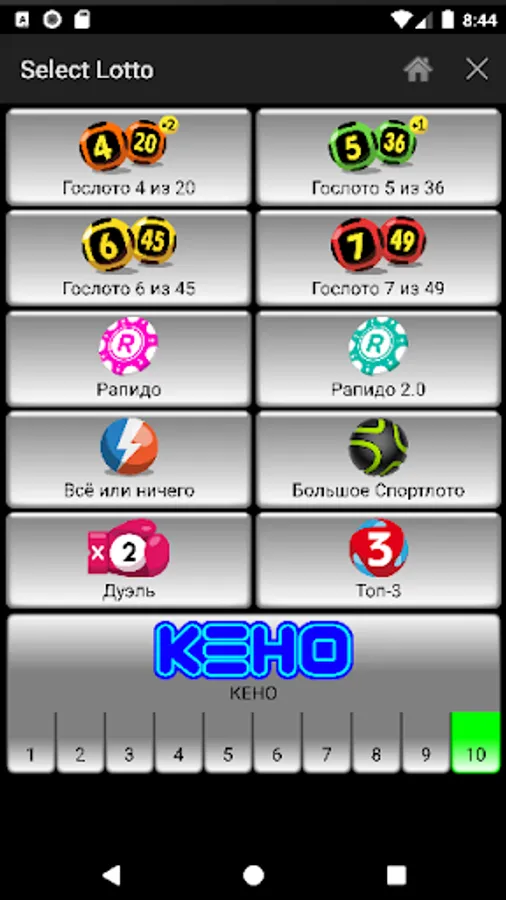 Гослото 4 из 20(Gosloto 4 out of 20), Гослото 7 из 49(Gosloto 7 out of 49), Гослото 6 из 45(Gosloto 6 out of 45), Гослото 5 из 36(Gosloto 5 out of 36), Большое Спортлото(Big Sportloto), Рапидо(Rapido), Рапидо 2.0(Rapido 2.0), Всё или ничего(All or nothing), Топ-3(Top-3), Дуэль(Duel), КЕНО(KENO).