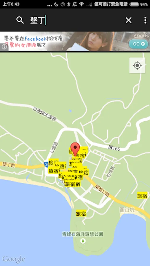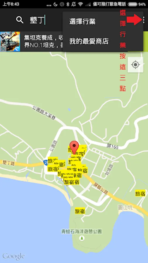 + 點一次圖標,「特約商店」的店名、網址、住址、電話 會顯示在圖標上方。