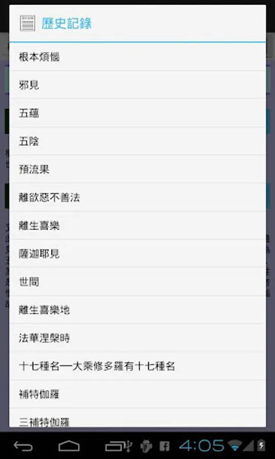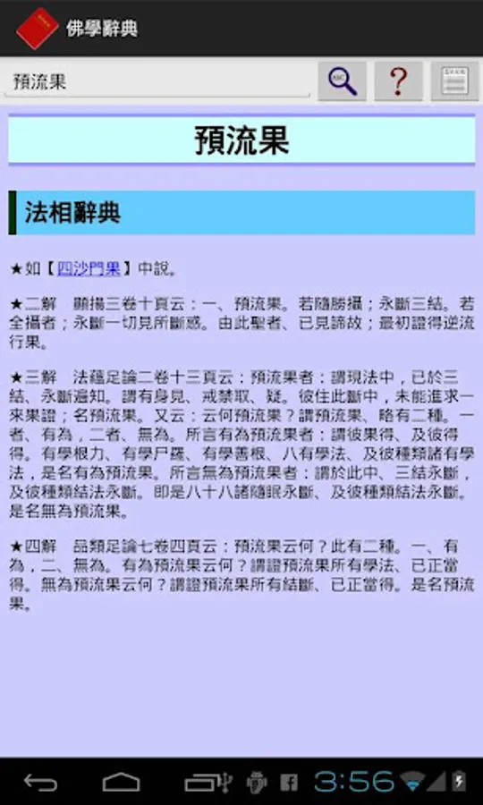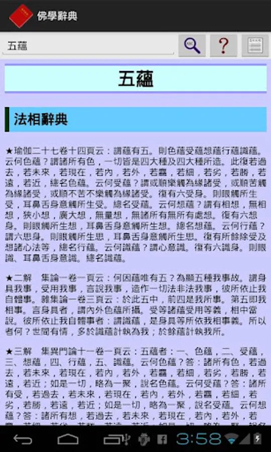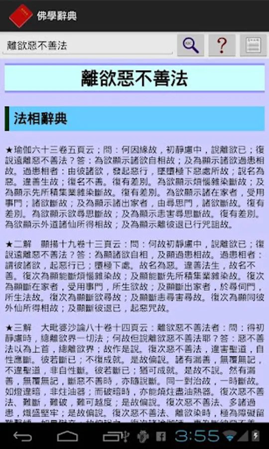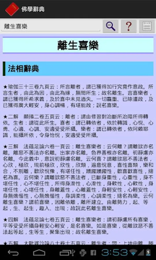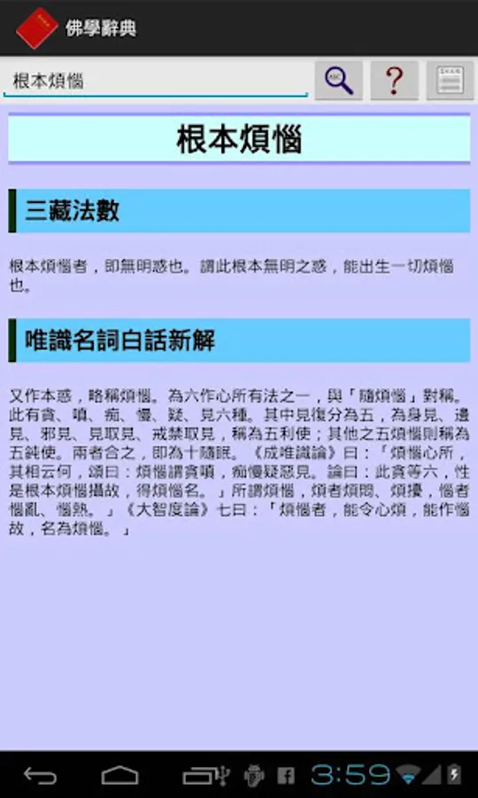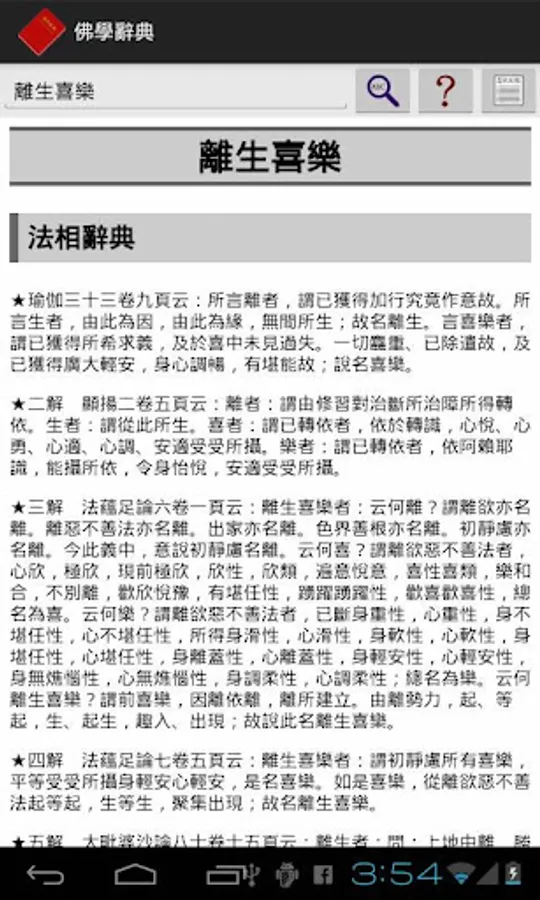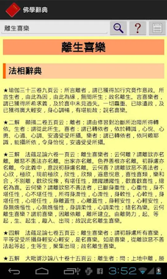 本軟體是目前唯一可以離線使用的佛學辭典,收入了《三藏法數》、《佛學常見辭彙》、《法相辭典》、《唯識名詞白話新解》四部辭典,約三萬個佛學詞彙。