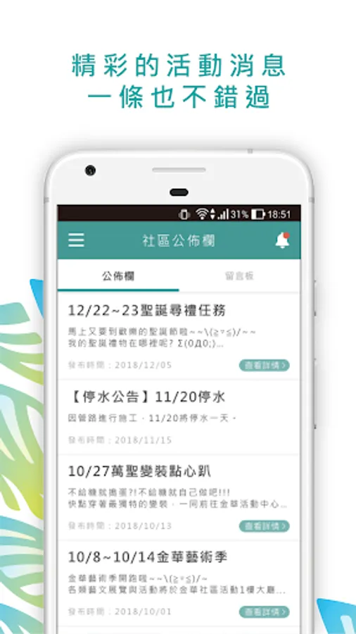 使用者可以於APP中公佈欄及留言版的部分,獲得社區內大大小小的活動消息、隨時發佈針對社區內的提問或提出社區優化的個人看法或建議,共同經營更加優質的社區生活。