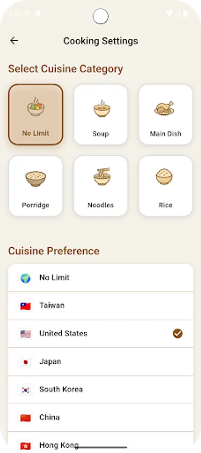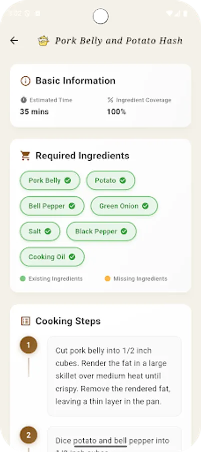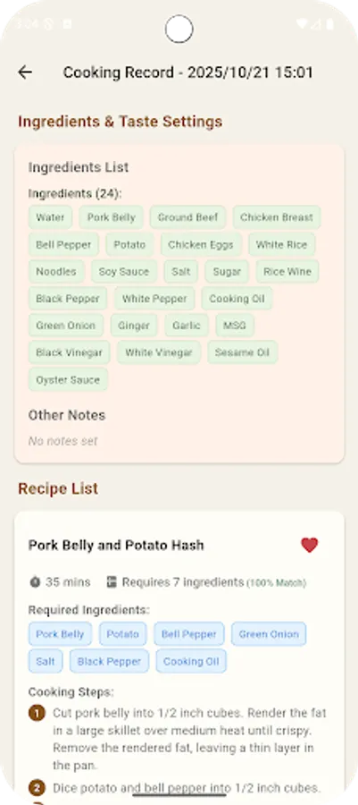 Choose your preferred cuisine (Chinese, Japanese, Korean, Western, etc.), dish type (main course, soup, dessert…), and even add personal notes. The AI adapts its recipes to your taste and ingredients — perfect for beginners or experienced cooks alike.