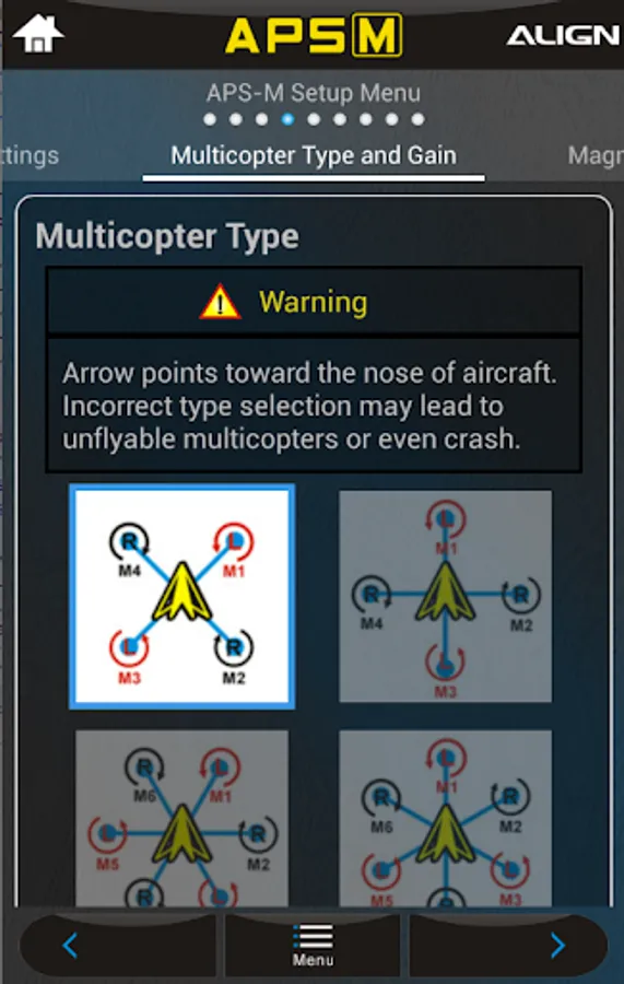 Supports 6 multicopter configurations: 4 rotors+, 4 rotors X, 6 rotors+, 6 rotors X, 8 rotors+, 8 rotors X.