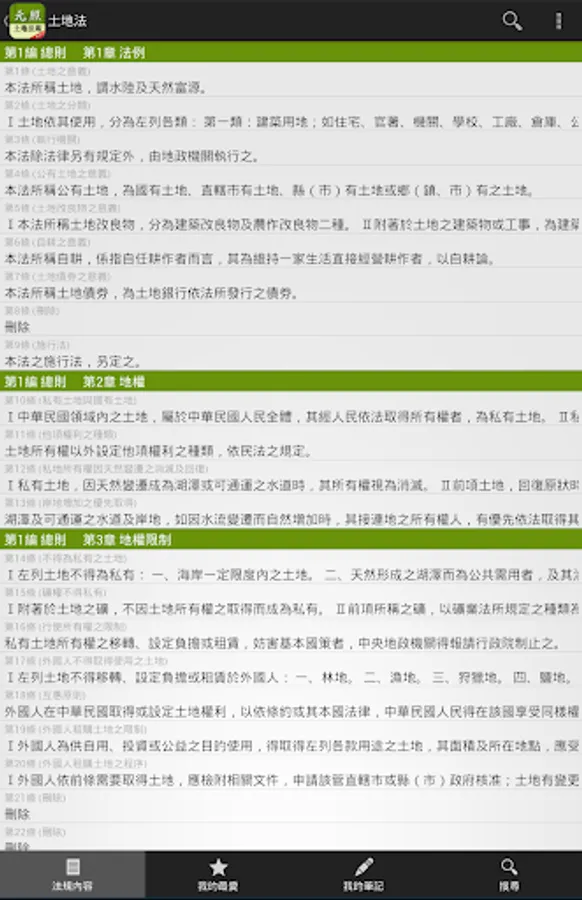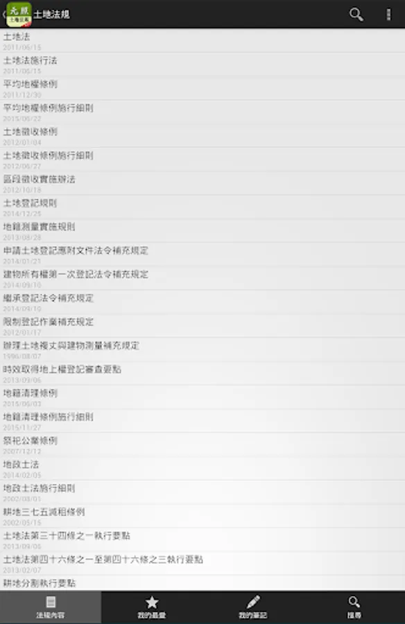 含土地法、土地稅法、平均地權條例、土地徵收條例、土地登記規則、不動產估價技術規則、不動產經紀業管理條例、地籍測量實施規則、地價調查估計規則、耕地三七五減租條例……等109個常用法規。
