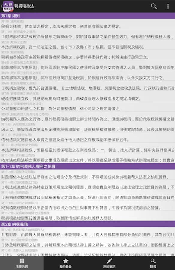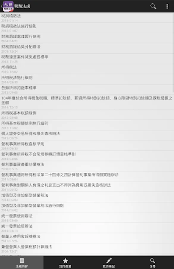 含土地稅法、遺產及贈與稅法、房屋稅條例、稅捐稽徵法、契稅條例、土地稅法施行細則、遺產及贈與稅法施行細則、所得稅法、加值型及非加值型營業稅法、特種貨物及勞務稅條例、關稅法……等70個常用法規。