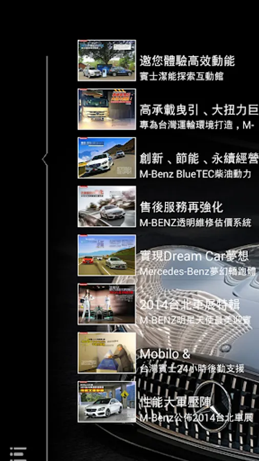 秉持著提供車迷更多元且即時的訊息,推出M-BENZ News App,不定時更新第一手最熱門有關M-BENZ汽車品牌的相關訊息與新聞,讓喜愛的M-BENZ品牌的車迷朋友能夠掌握任何的最新動向,不只方便瀏覽,更可建立個人書籤,並透過Mail即時分享給同好、好友。結合智慧型手持裝置的便利優勢,結合影音、導航、電子書等豐富功能,提供據點查詢、車款型錄、專題報導等品牌相關資訊,滿足車迷們對於M-BENZ品牌所有知性的需求。