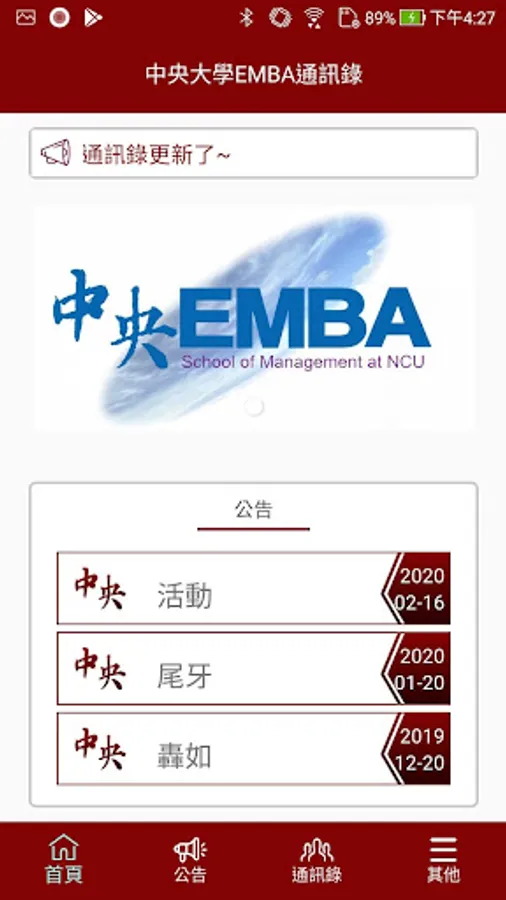 "Central University EMBA Alumni Alumni Association" was officially registered in the Ministry of the Interior in 2010 (there is no. In order to facilitate contact and communication, you can query the contact information of recent conference activities and other people through the Contacts App. The functions are as follows: