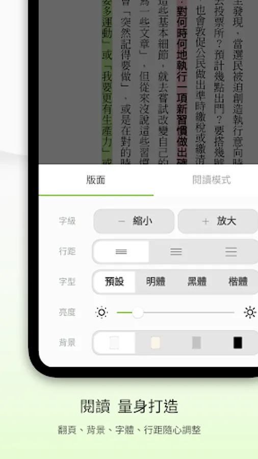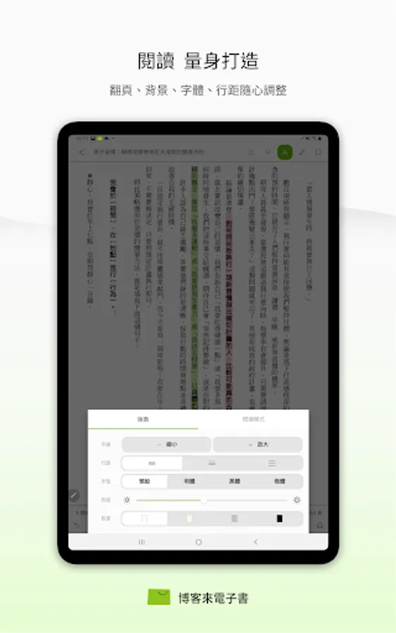 9. Adjust the reading layout as you like: font, size, background, and page turning direction multiple custom options
