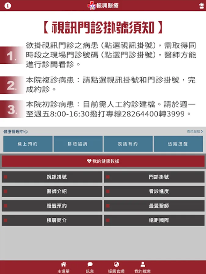 The purpose of this App is to provide patients in our hospital with a more convenient medical experience and better medical care. Therefore, in addition to the original appointment registration and consultation progress query functions of the old version of the Zhenxing Hospital App, this App also adds advanced functions such as remote video outpatient registration and consultation, and online customer service. It also has health management functions, which can be It integrates all the health and physiological information of users in Zhenxing Hospital, and can be connected with third-party wearable devices to facilitate the actual implementation of daily health and physiological data measurement and monitoring, which is helpful for the control of chronic diseases. In addition, the revitalization health management center's online appointment, inspection consultation, and tracking reminder functions have also been added, allowing users to fully grasp their health status and tracking schedule. Looking forward to helping users implement personal health management and achieve the goal of promoting health!