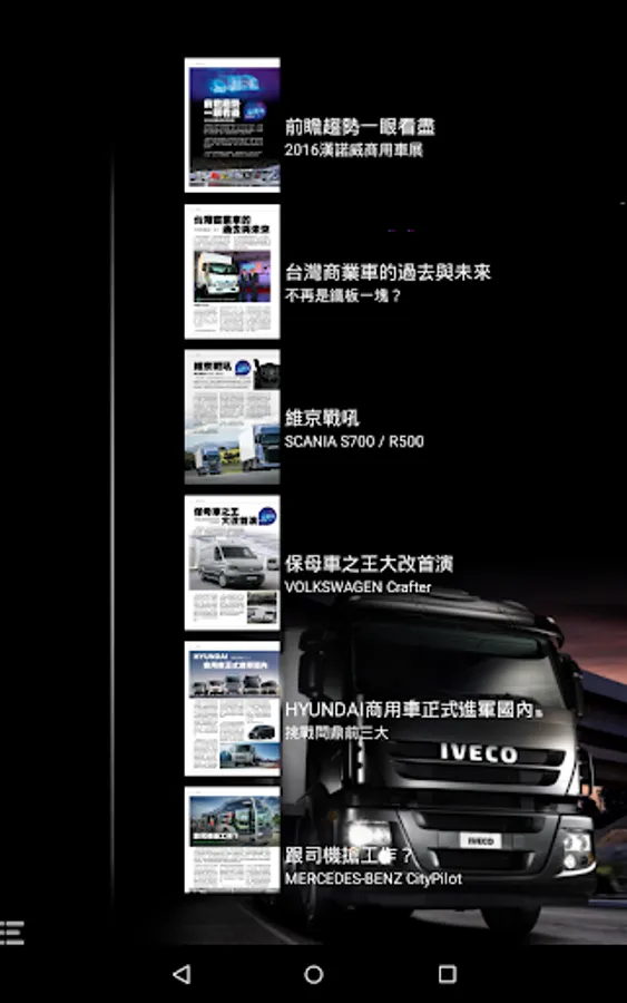 因應智慧型手機與平板普及,「CVNews商業車誌Apps」讓您一機在手,滑滑手指便能輕鬆掌握車壇最新資訊,深入淺出的筆調、豐富精采的照片,以及隨時更新最快、最新、最熱門的商業車、車展、輪胎、耗品、法規與產業等相關新聞,只要使用您手上的智慧型手機或平板電腦安裝「CVNews商業車誌Apps」,即可輕鬆擁有!