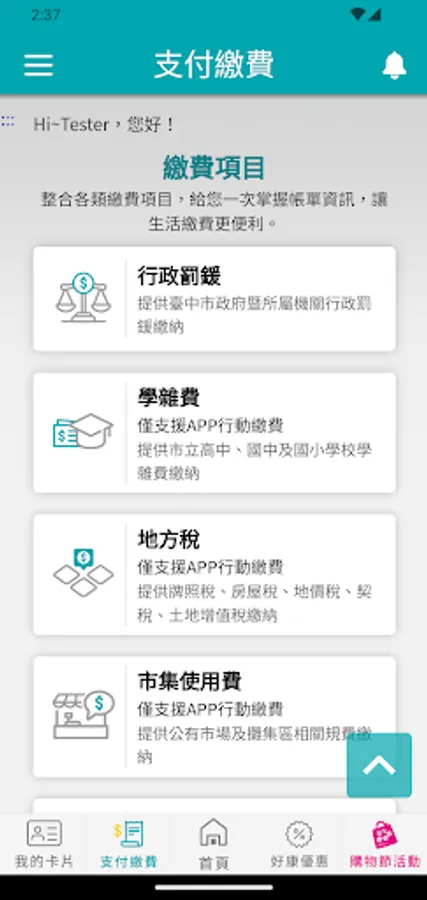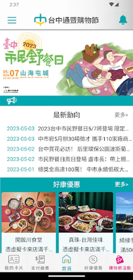 The Taichung Pass and Shopping Festival APP provides integrated municipal services, such as: latest trends, digital citizen virtual card, single sign-in, personalized service, life welfare information, payment and payment, good health discounts, etc. In addition, it combines the relevant functions of the "Taichung Shopping Festival", including the latest news, login invoice (scanning and manual login), cooperative stores, invoice records (lottery tickets, cloud invoices, online prize redemption), my messages, etc., to provide public Diversified and convenient digital services.