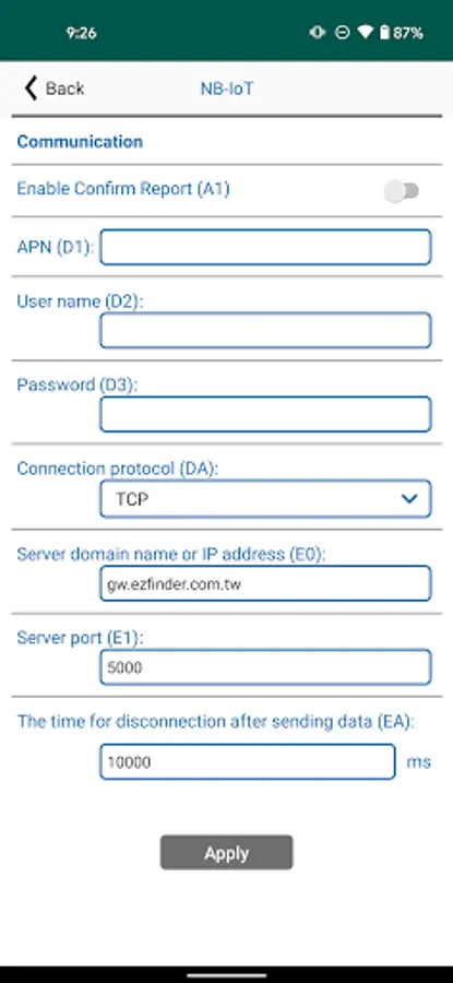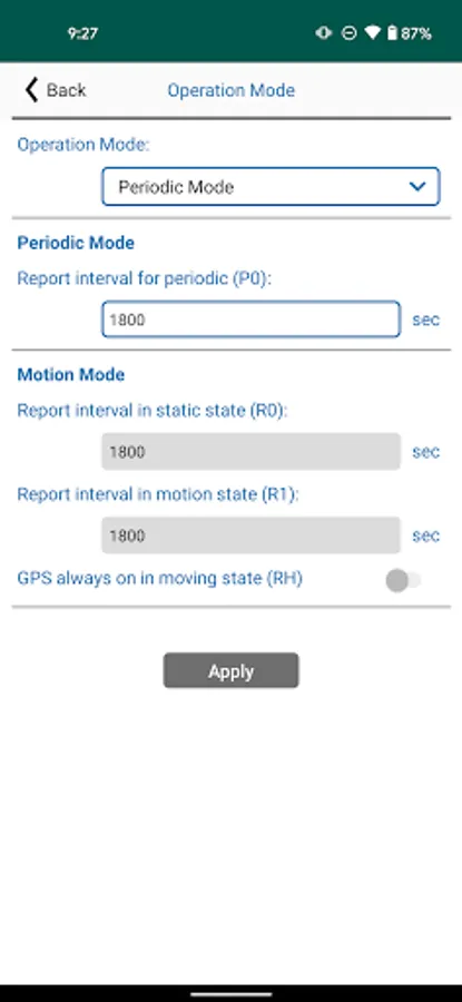 - Operation Mode: Periodic or Motion mode/ Report interval