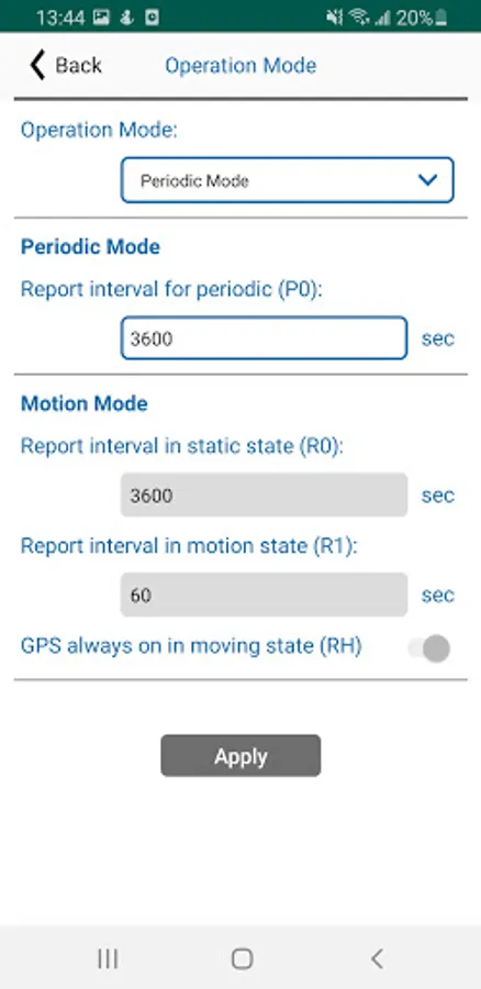 - Operation Mode: Periodic or Motion mode/ Report interval