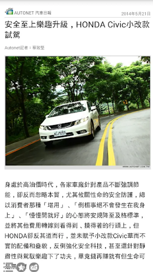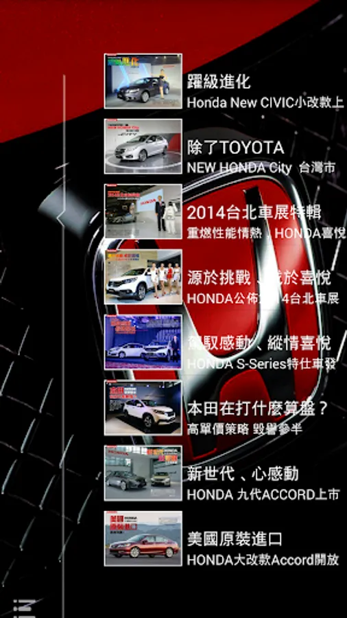 秉持著提供車迷更多元且即時的訊息,推出HONDA News App,不定時更新第一手最熱門有關HONDA汽車品牌的相關訊息與新聞,讓喜愛的HONDA品牌的車迷朋友能夠掌握任何的最新動向,不只方便瀏覽,更可建立個人書籤,並透過Mail即時分享給同好、好友。結合智慧型手持裝置的便利優勢,結合影音、導航、電子書等豐富功能,提供據點查詢、車款型錄、專題報導等品牌相關資訊,滿足車迷們對於HONDA品牌所有知性的需求。