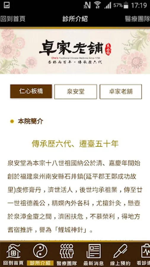 Zhuo old shop clinic as "Zhuojia Quan An Tang old shop" Six children Zhuo broadcast Confucianism in the Republic of one hundred and five years to set up Zhuo old shop traditional Chinese flagship museum, located in the pump head after Jinsha Town Kinmen County historic site, "Huang Xuan remarkable six-way big house ", the first monument to the Golden Gate in the clinic, in the quaint environment, provide the best quality medical services to the people in Kinmen.