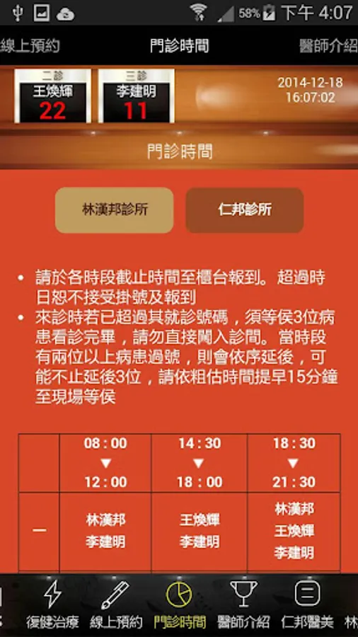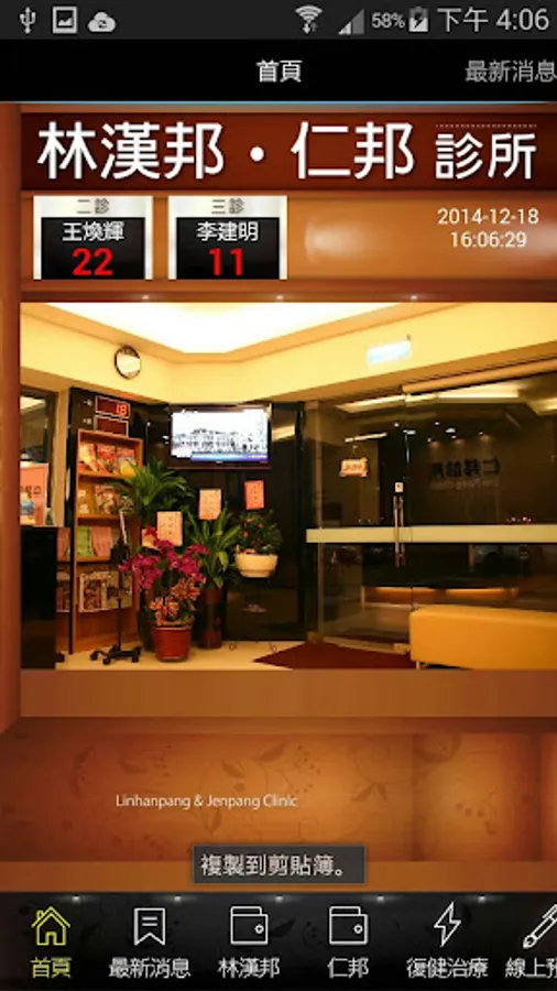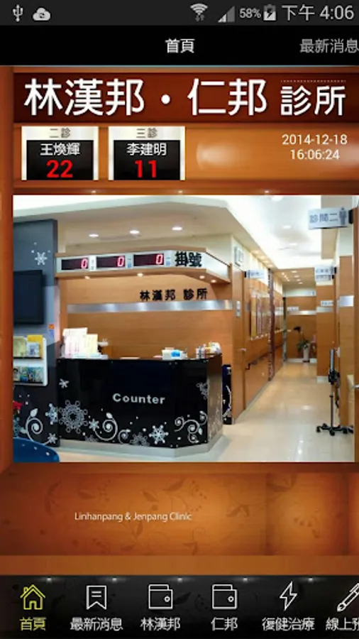 Linhan Bang Physician Visits in Linkou over 10 years, and the establishment of the Republic of China 98 years Linhan Bang Clinic March 5. There the Court Family Medicine, within child therapy, surgery, orthopedics and rehabilitation treatment, ranging from 1 year to 99 years old are our care. We insist on providing high-quality and complete professional medical services to families in each community to become family physicians.