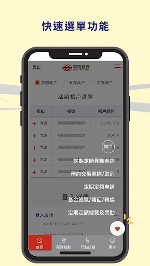 ※ Foreign currency services: foreign currency balance inquiry, foreign currency transaction details inquiry, foreign currency transfer in Taiwan, foreign currency transfer in the same currency to another account, personal transfer in different currency accounts, foreign currency appointment inquiry and cancellation, foreign currency inward remittance inquiry, foreign currency deposit receipt return inquiry, Foreign currency remittance inquiry.
