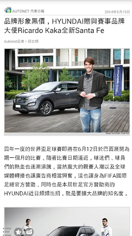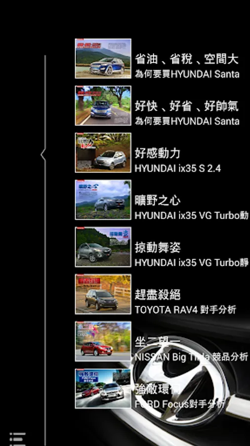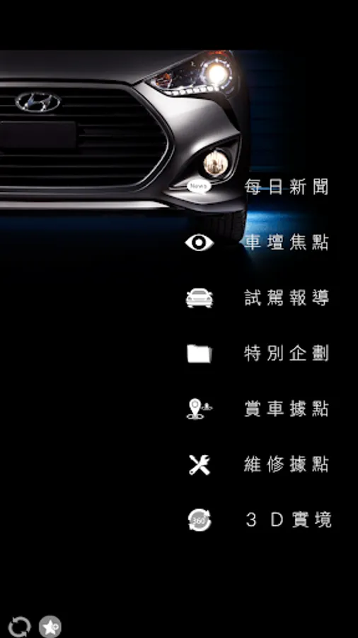 秉持著提供車迷更多元且即時的訊息,推出HYUNDAI News App,不定時更新第一手最熱門有關HYUNDAI汽車品牌的相關訊息與新聞,讓喜愛的HYUNDAI品牌的車迷朋友能夠掌握任何的最新動向,不只方便瀏覽,更可建立個人書籤,並透過Mail即時分享給同好、好友。結合智慧型手持裝置的便利優勢,結合影音、導航、電子書等豐富功能,提供據點查詢、車款型錄、專題報導等品牌相關資訊,滿足車迷們對於HYUNDAI品牌所有知性的需求。