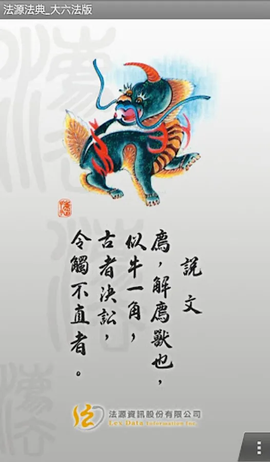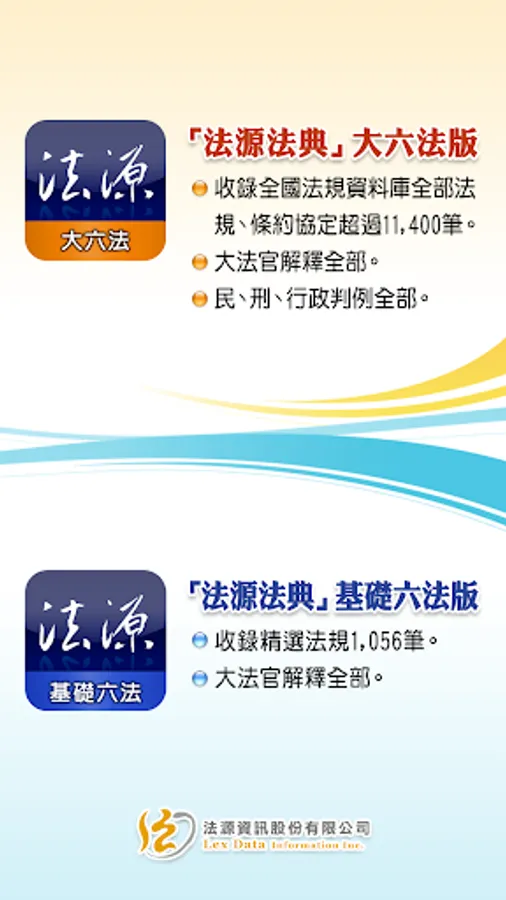 二、「法源法典」大六法版,係從「法源法律網」(http://www.lawbank.com.tw)資料庫中,精選重要常用法規、條約協定、全部大法官解釋、最高法院民事判例、最高法院刑事判例、最高行政法院判例等資料,提供使用者於行動裝置上查詢資料。