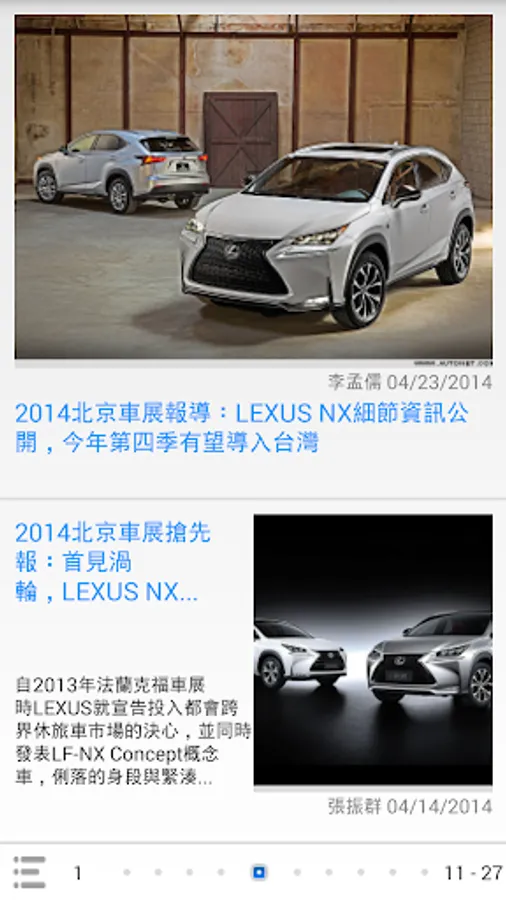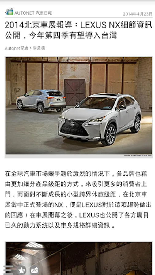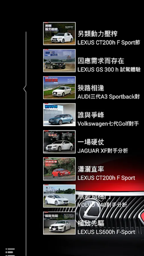 秉持著提供車迷更多元且即時的訊息,推出LEXUS News App,不定時更新第一手最熱門有關LEXUS汽車品牌的相關訊息與新聞,讓喜愛的LEXUS品牌的車迷朋友能夠掌握任何的最新動向,不只方便瀏覽,更可建立個人書籤,並透過Mail即時分享給同好、好友。結合智慧型手持裝置的便利優勢,結合影音、導航、電子書等豐富功能,提供據點查詢、車款型錄、專題報導等品牌相關資訊,滿足車迷們對於LEXUS品牌所有知性的需求。
