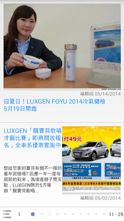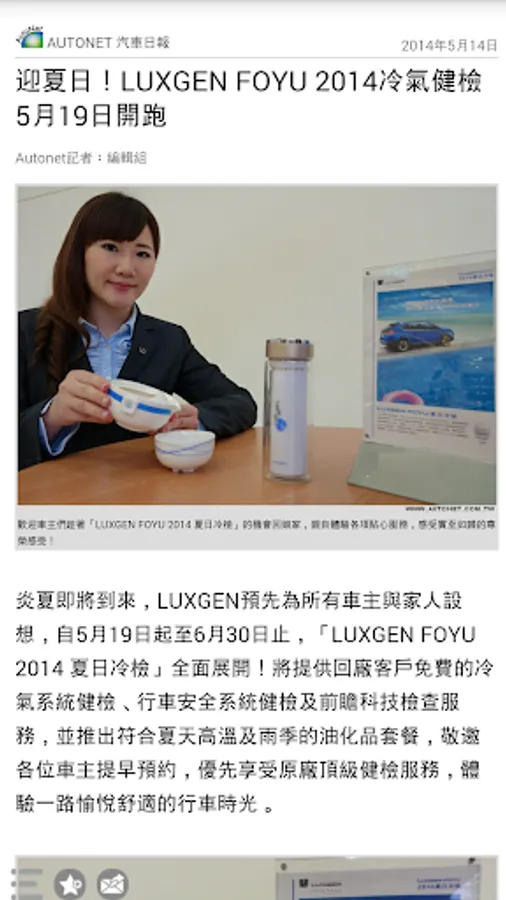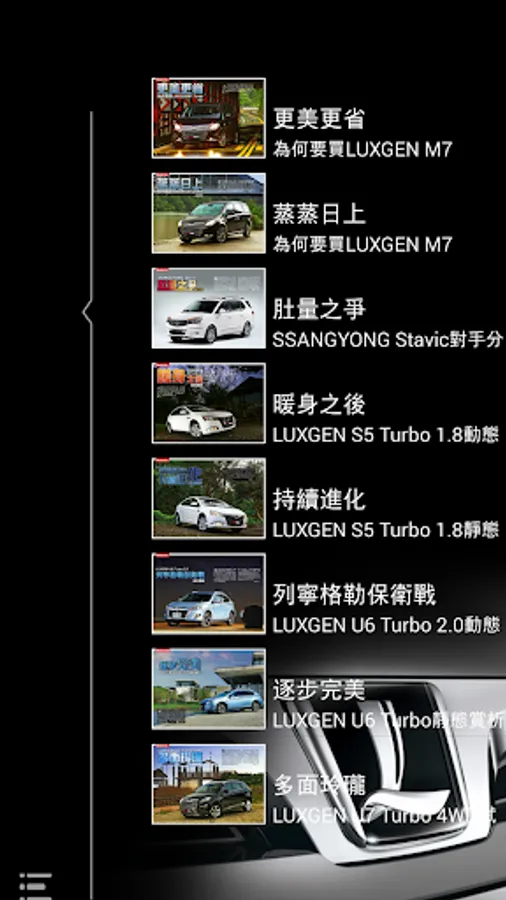 秉持著提供車迷更多元且即時的訊息,推出LUXGEN News App,不定時更新第一手最熱門有關LUXGEN汽車品牌的相關訊息與新聞,讓喜愛的LUXGEN品牌的車迷朋友能夠掌握任何的最新動向,不只方便瀏覽,更可建立個人書籤,並透過Mail即時分享給同好、好友。結合智慧型手持裝置的便利優勢,結合影音、導航、電子書等豐富功能,提供據點查詢、車款型錄、專題報導等品牌相關資訊,滿足車迷們對於LUXGEN品牌所有知性的需求。