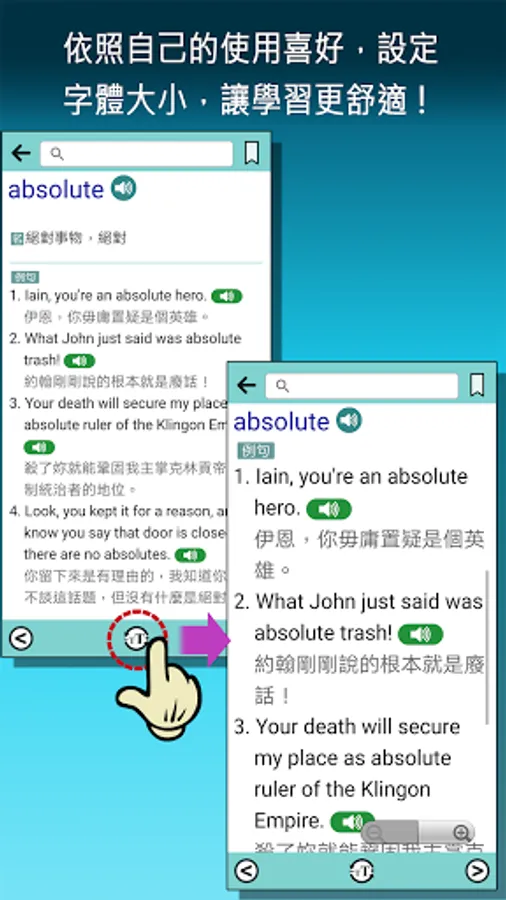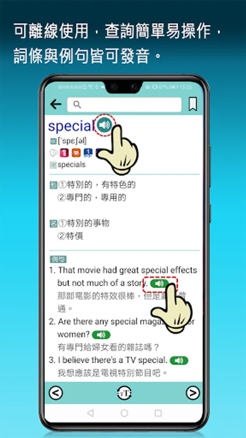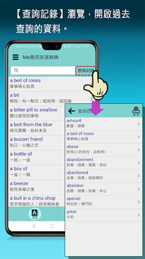 "Me Practical English-Chinese Dictionary" provides phonetic symbols, parts of speech, word meanings, and has pronunciation functions. It also provides tense changes of common verbs, plural changes of nouns, comparative and superlative changes of adjectives/adverbs, so you can not only learn the correct usage of single characters , And practice pronunciation. You can also add the vocabulary you have learned or the vocabulary you think is difficult to your bookmarks to facilitate future review.
