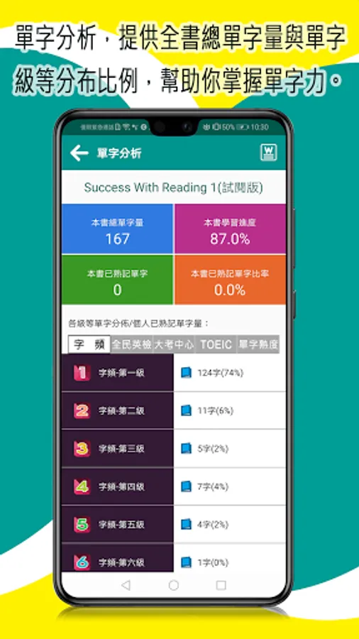 ● [Voice Analysis] Provide the distribution ratio of the total number of words in the book to the word level, etc., so that you can understand the difficulty of the words in the book before learning.
