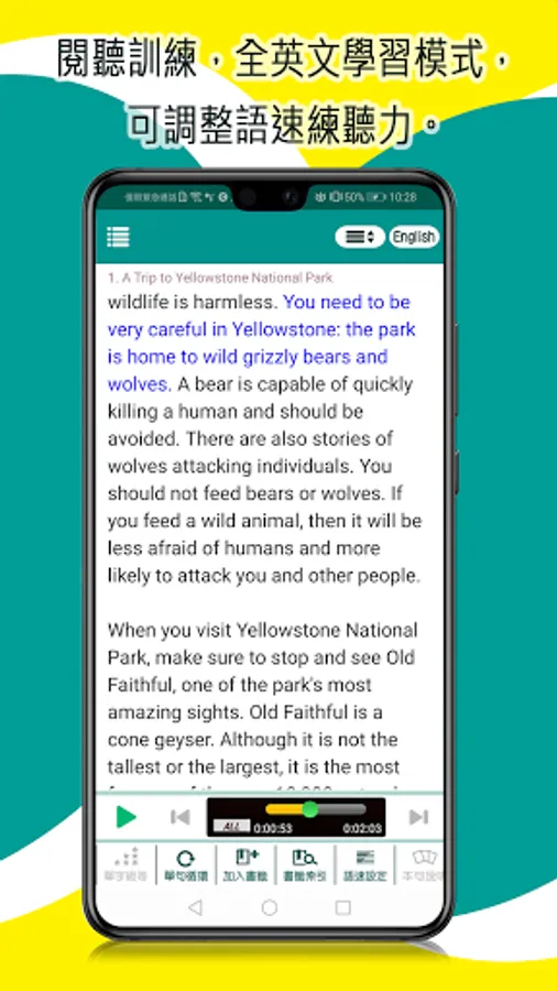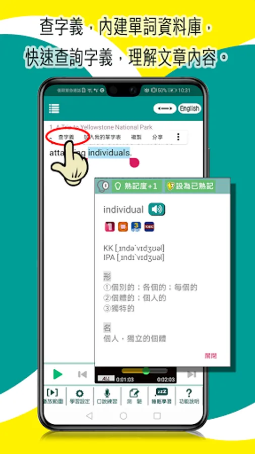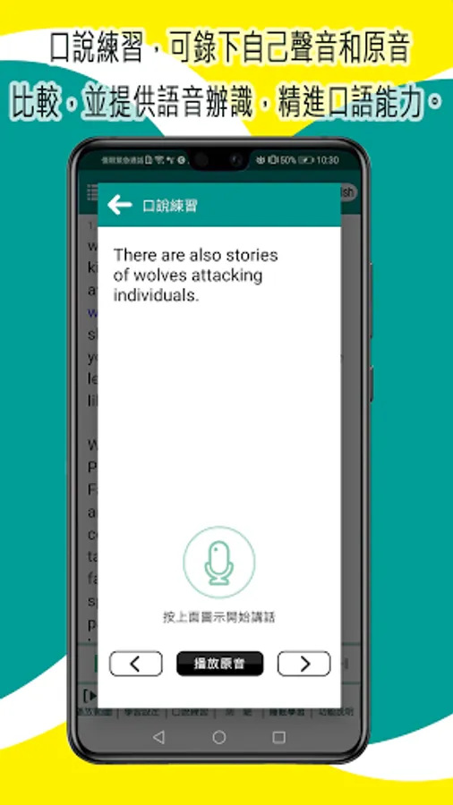 ● [Speaking practice] You can record your own voice and compare it with the original voice, and provide phonetic recognition to refine the language ability.