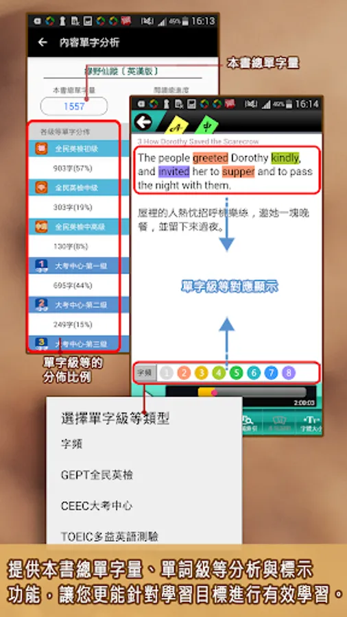 2. Content vocabulary analysis, providing the distribution ratio of the total vocabulary volume and vocabulary level of the content of the book, so that you can understand the difficulty of the vocabulary used in the content of the book before you study.