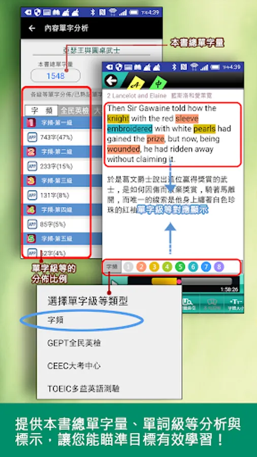 2. Content vocabulary analysis, providing the distribution ratio of the total vocabulary volume and vocabulary level of the content of the book, so that you can understand the difficulty of the vocabulary used in the content of the book before you study.