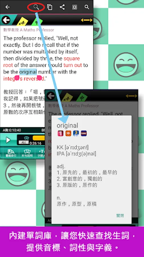 5. 【查字義】:內建單詞資料庫,提供音標、詞性、字義等查詢,協助快速理解文章內容。