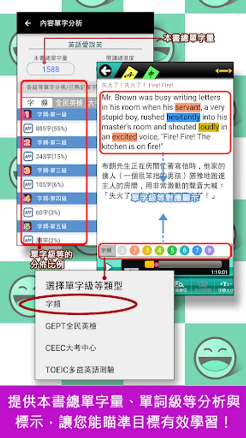 3. 【單字分析】:提供本書內容總單字量與單字級等分佈比例,讓您在學習前即可了解本書內容所使用單字的難易度。