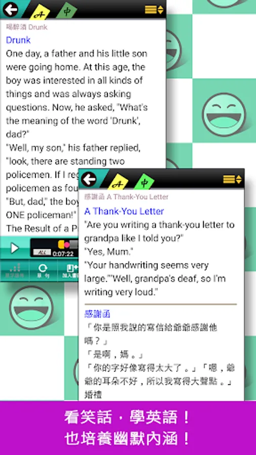 看了這些笑話,不但能提高你的閱讀能力,在捧腹大笑,會心一笑之外,更能讓你在愉快的氣氛中親近英文,藉此瞭解多元的西方文化和生活方式,輕鬆學道地的英語。如果您好不容易開始下定決心學習英文,但看到呆板的教材卻又想打瞌睡,那你一定不能錯過!