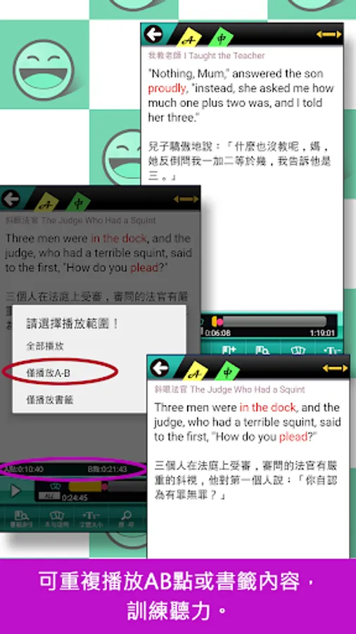 2. 【聽力訓練】自動或循環朗讀、複讀範圍與次數均可自訂,訓練聽力超有感。