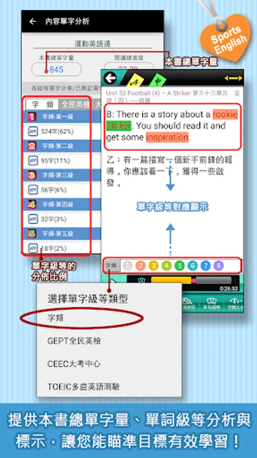 4. 【單詞級等標示】:標示學習內容的單詞級等,包含字頻(8級等)、大考中心(6級等)、全民英檢(3級等)、多益常考用字。