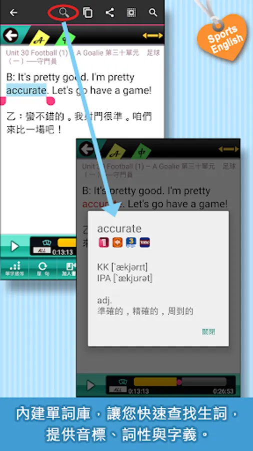 5. 【查字義】:內建單詞資料庫,提供音標、詞性、字義等查詢,協助快速理解文章內容。