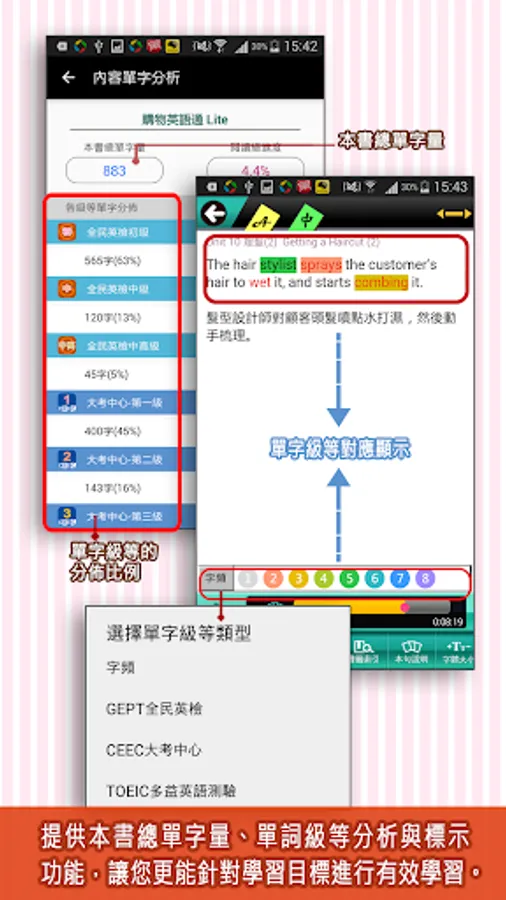 2. Content vocabulary analysis, providing the distribution ratio of the total vocabulary volume and vocabulary level of the content of the book, so that you can understand the difficulty of the vocabulary used in the content of the book before you study.