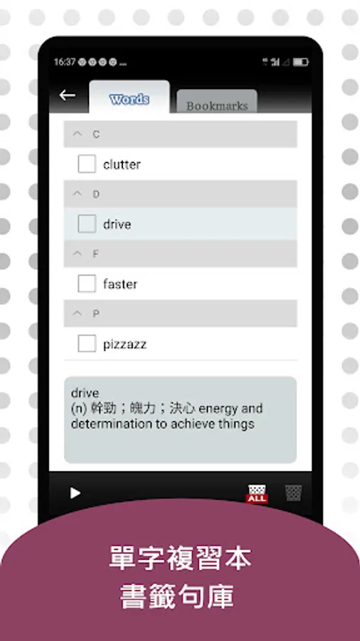 8. Bookmark function: bookmark the content that needs to be reviewed or used, and play exercises repeatedly.