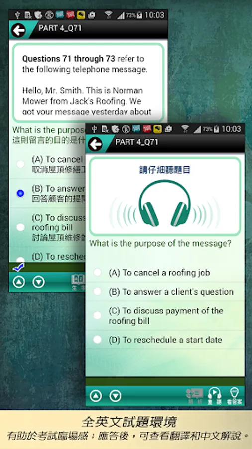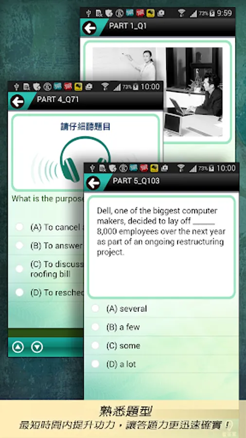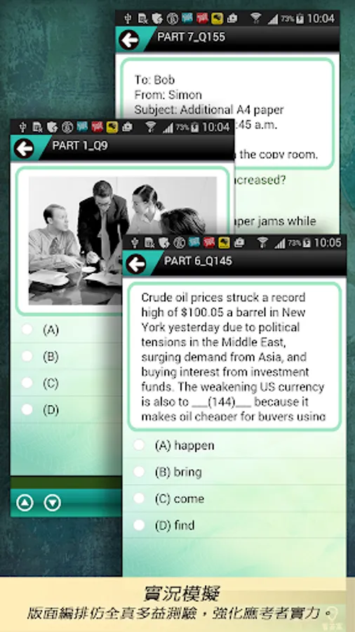 Formal exam questions are simulated by a number of professional foreign teachers. The situation is diversified and the content is authentic, which is in line with the concept of the new version of TOEIC that is close to the real communication situation.
