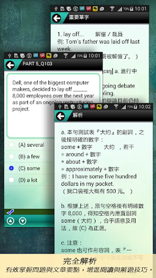 The questions are completely analyzed, including single words, phrases, grammar, sentence patterns, and translations, and all the important points are not missed. The details are detailed, easy to understand, and are most suitable for self-study. In a short period of time, English listening and reading skills will surely improve by leaps and bounds, and the TOEIC ® test must get a high score!