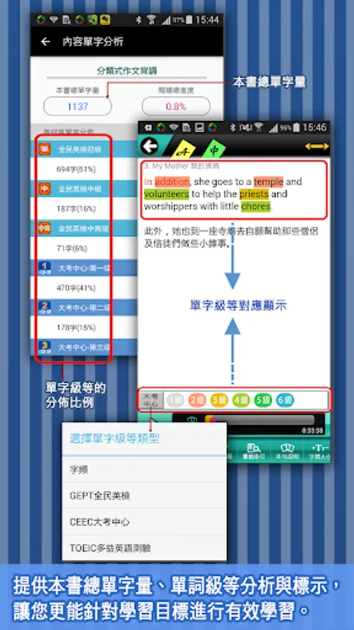 2. Content vocabulary analysis: Provide the distribution ratio of the total vocabulary volume and vocabulary level of the content of the book, so that you can understand the difficulty of the vocabulary used in the content of this book before you study.
