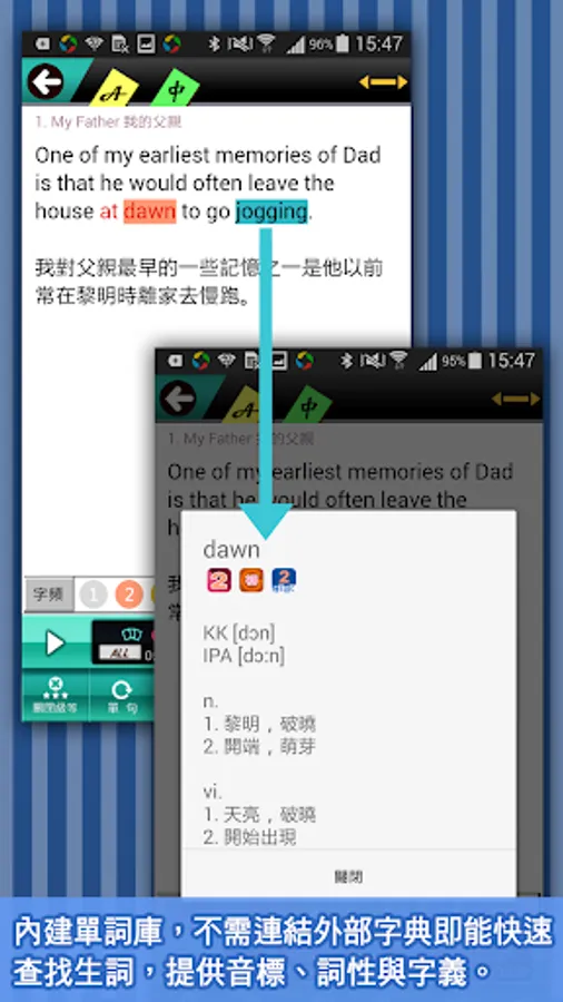 5. Word meaning checking function: built-in word database, providing phonetic symbols, part of speech, and meanings for the words inquired, helping to quickly understand the content of the article.