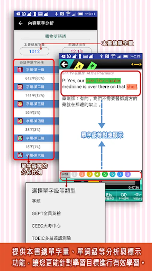 4. 單詞級等標示,可依學習目標,選擇標示出學習內容的單詞級等,包含字頻(8級等)、大考中心(6級等)、全民英檢(3級等)、多益常考用字。一鍵操作,讓您一目了然,可強化單字力學習。