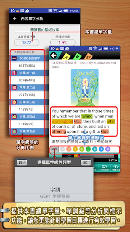 ●內容單字分析,提供本書內容總單字量與單字級等分佈比例,讓您在學習前即可了解本書內容所使用單字的難易度。