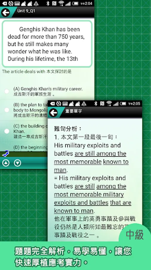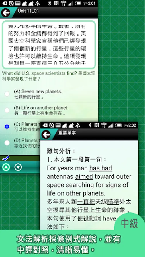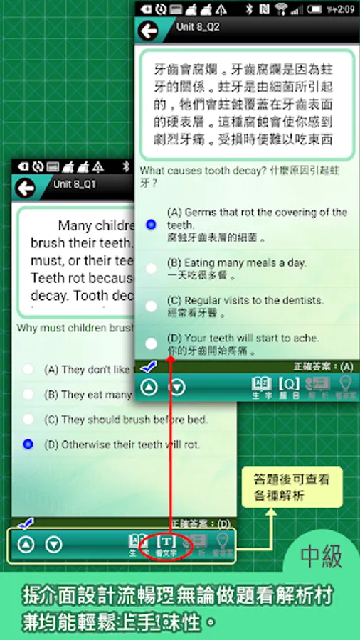 2. The test interface is all in English. After answering, you can see the Chinese translation and commentary.