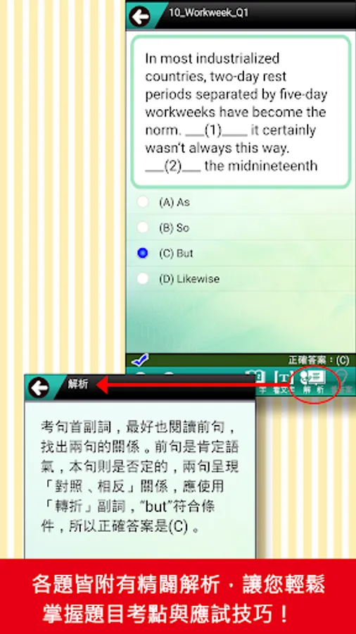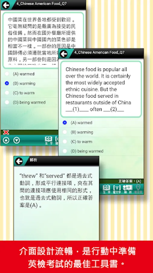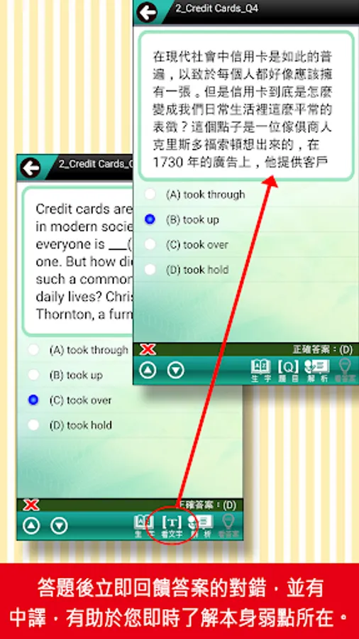 2. The test interface is all in English. After answering, you can see the Chinese translation and commentary.
