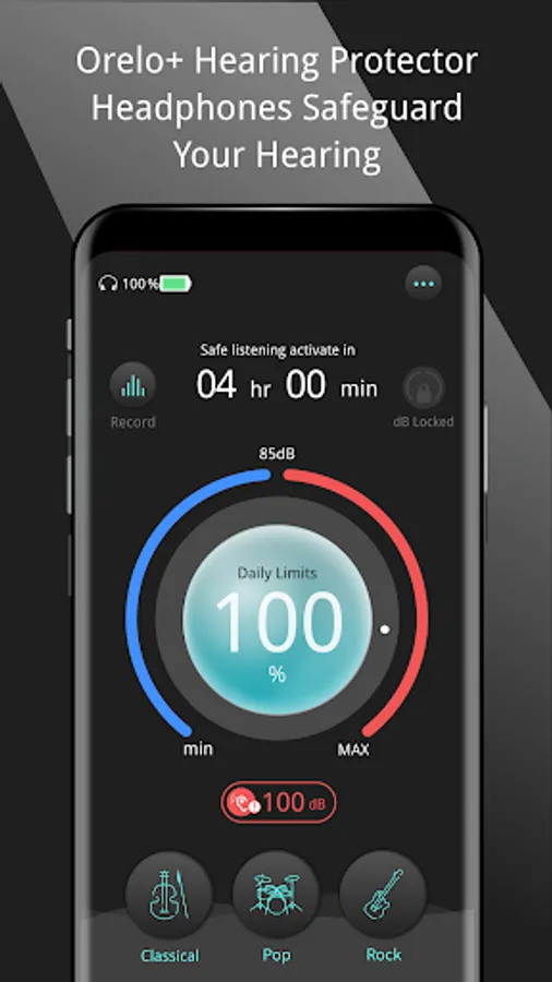 Display current sound volume (dB). To safeguard your hearing, our patented hearing protection algorithm of App will gradually adjust the volume to 85 dB.