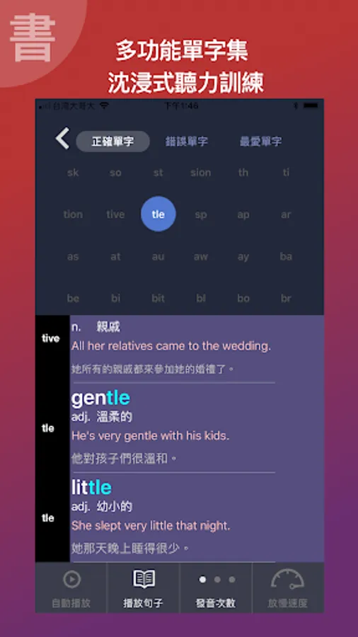 #无限免免习习功能: [single word set], [English spelling king], [sentence champion list] let you completely review the words you have learned!