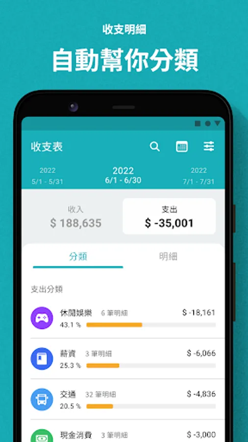 Automatic classification of income and expenses, real-time update of net asset bar graph, and analysis of monthly spending ratio.