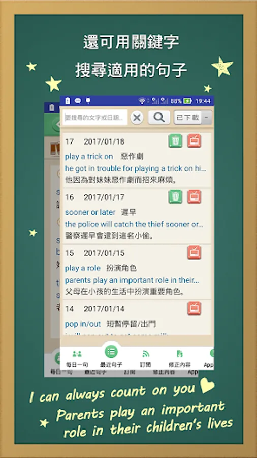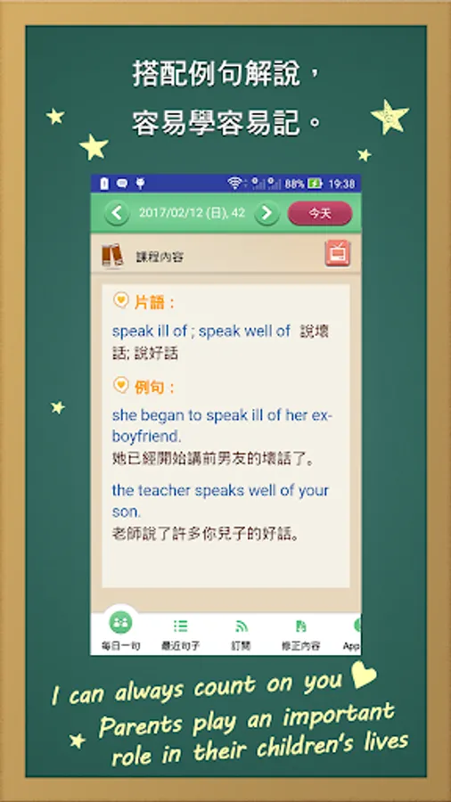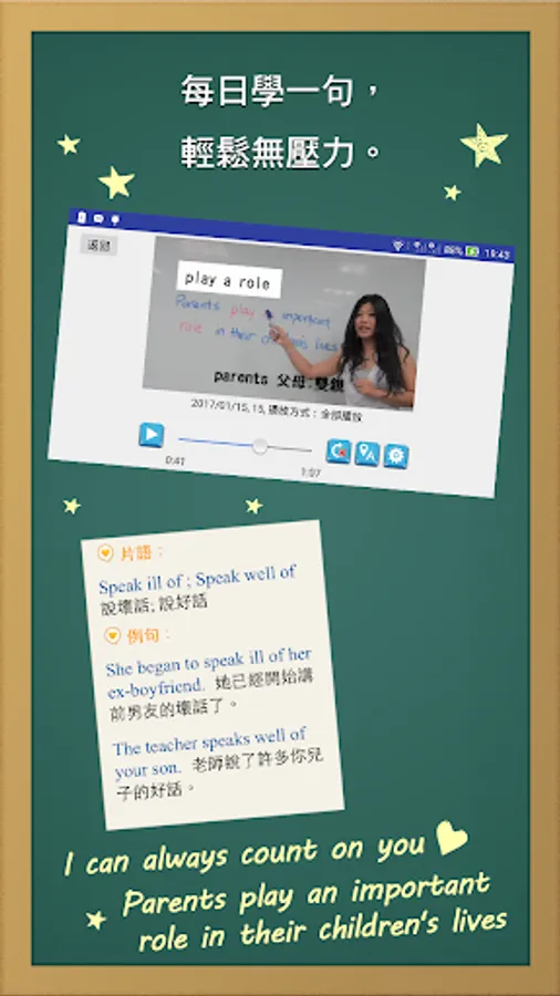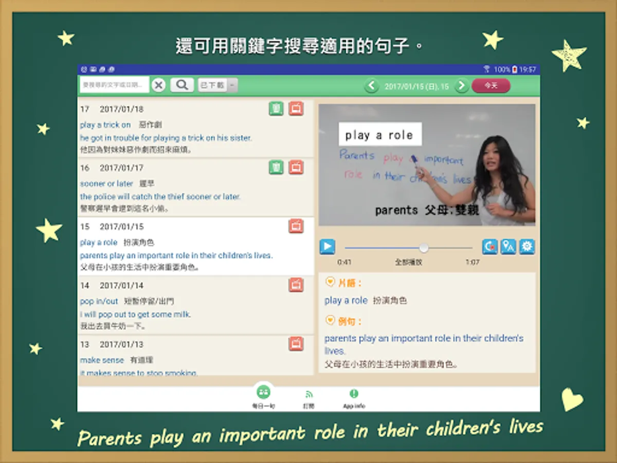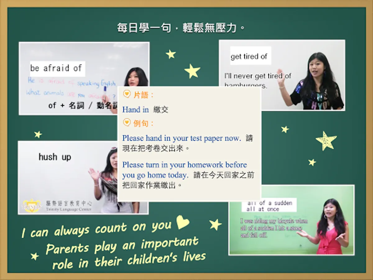 提供每日的片語及例句內容,並提供真人影音教學,實際解說片語用法及單字介紹。